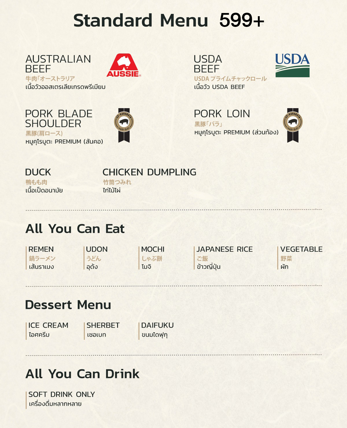 ชาบู-ชาบูและสุกี้ยากี้ ต้นตำรับญี่ปุ่นแท้ๆ คัดสรรวัตถุดิบคุณภาพพรีเมียม ไม่ว่าจะเป็น เนื้อวัว Australian ชิ้นโตหนาแต่นุ่ม เนื้อวัว US เนื้อติดมันนุ่มอร่อย หมูคุโรบูตะ ไก่ไม้ไผ่ที่ทำมาจากไก่เบญจา ปลอดสาร ปลอดภัย เป็ดอนามัย ผักปลอดสารพิษหลากชนิด ตบท้ายด้วยของหวานไดฟุกุหลายรส และไอศกรีม homemade ให้อร่อยแบบอิ่มไม่อั้น ในราคา 599+ บาท